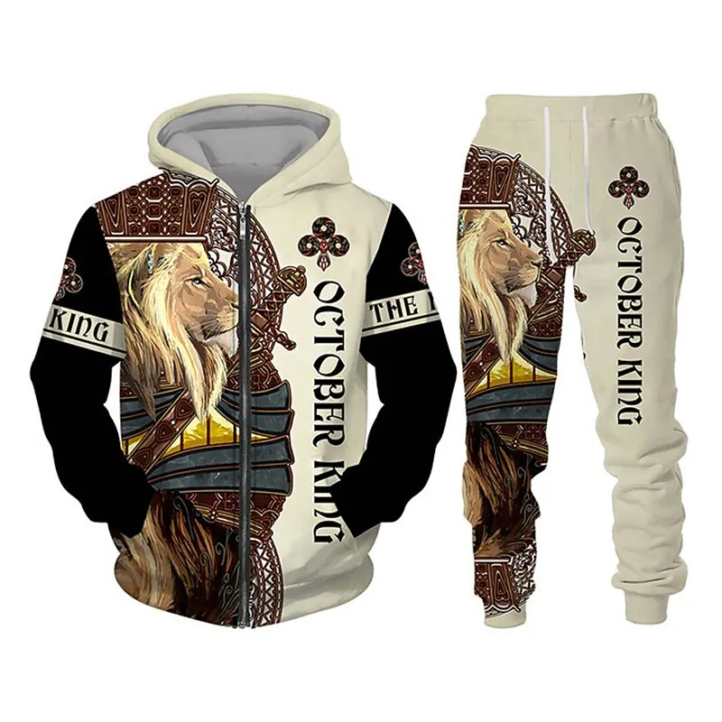 Men's Zip Hoodie Tracksuit Full Hoodies Set Lion Graphic Zipper 2 Piece Hooded S