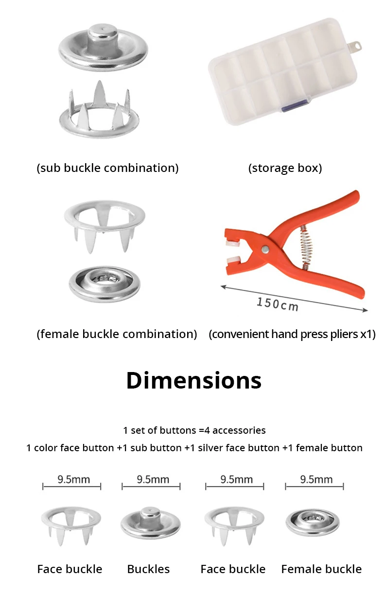 1. High-quality material: The snap button is made of stainless steel, which is strong and durable, rust-proof and corrosion-resistant, not easy to break and deform. The pliers are made of lastic, which is highly rigid and comfortable to use.